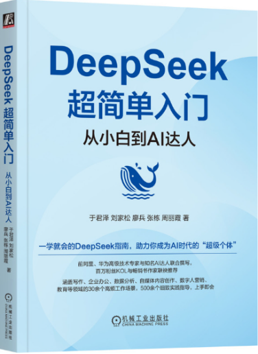 简介:该书由于君泽等多位前阿里、华为技术专家与AI达人合著,是零基础入门DeepSeek的实操指南。全书覆盖写作、办公、数据分析、自媒体创作、数字营销等30余个高频场景,通过500余个细化实践指导,将复杂的AI应用拆解为“即学即用”的步骤。书中既有百万粉丝KOL与畅销书作家的联合推荐,又以通俗案例和直观操作演示,让新手快速掌握DeepSeek核心用法,助力普通人从AI小白蜕变为智能时代的“超级个体”。